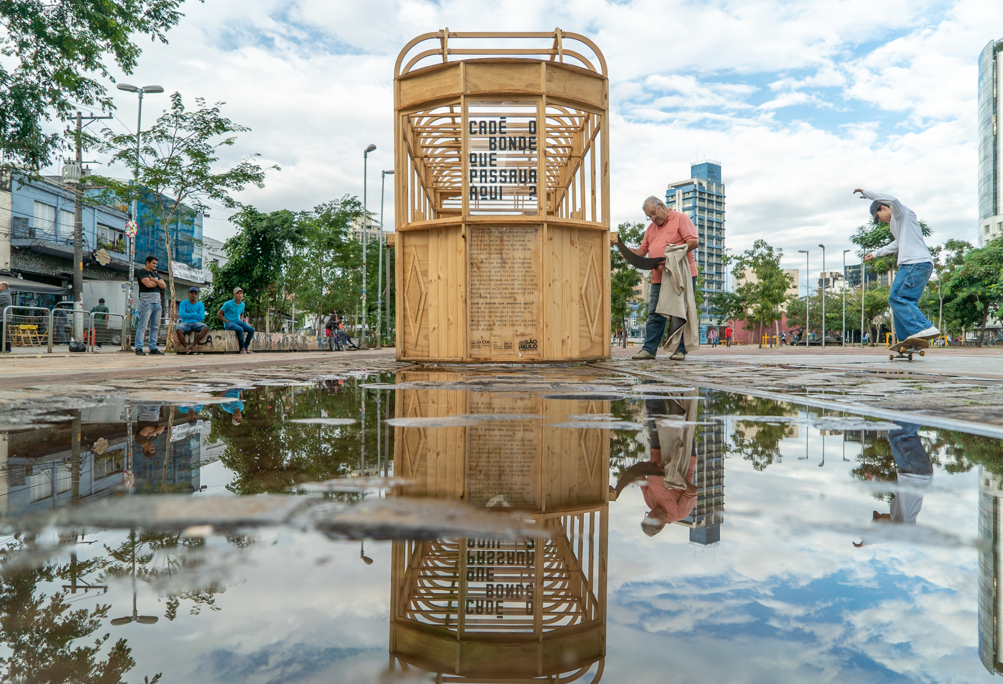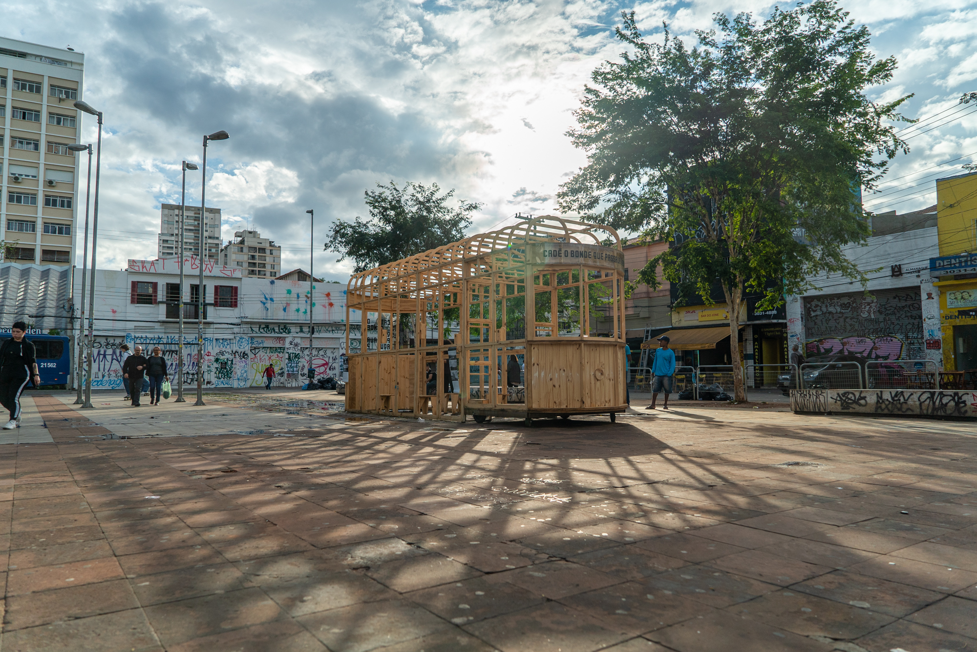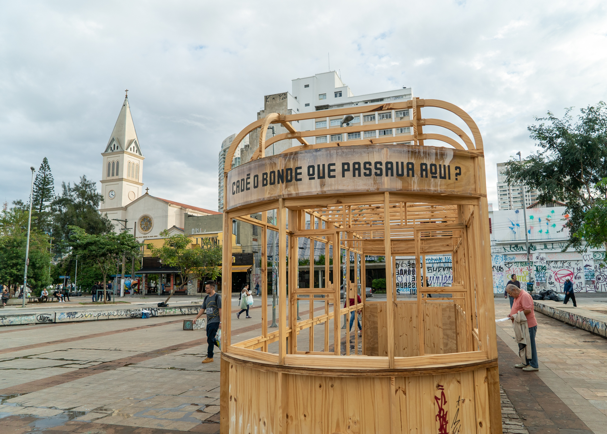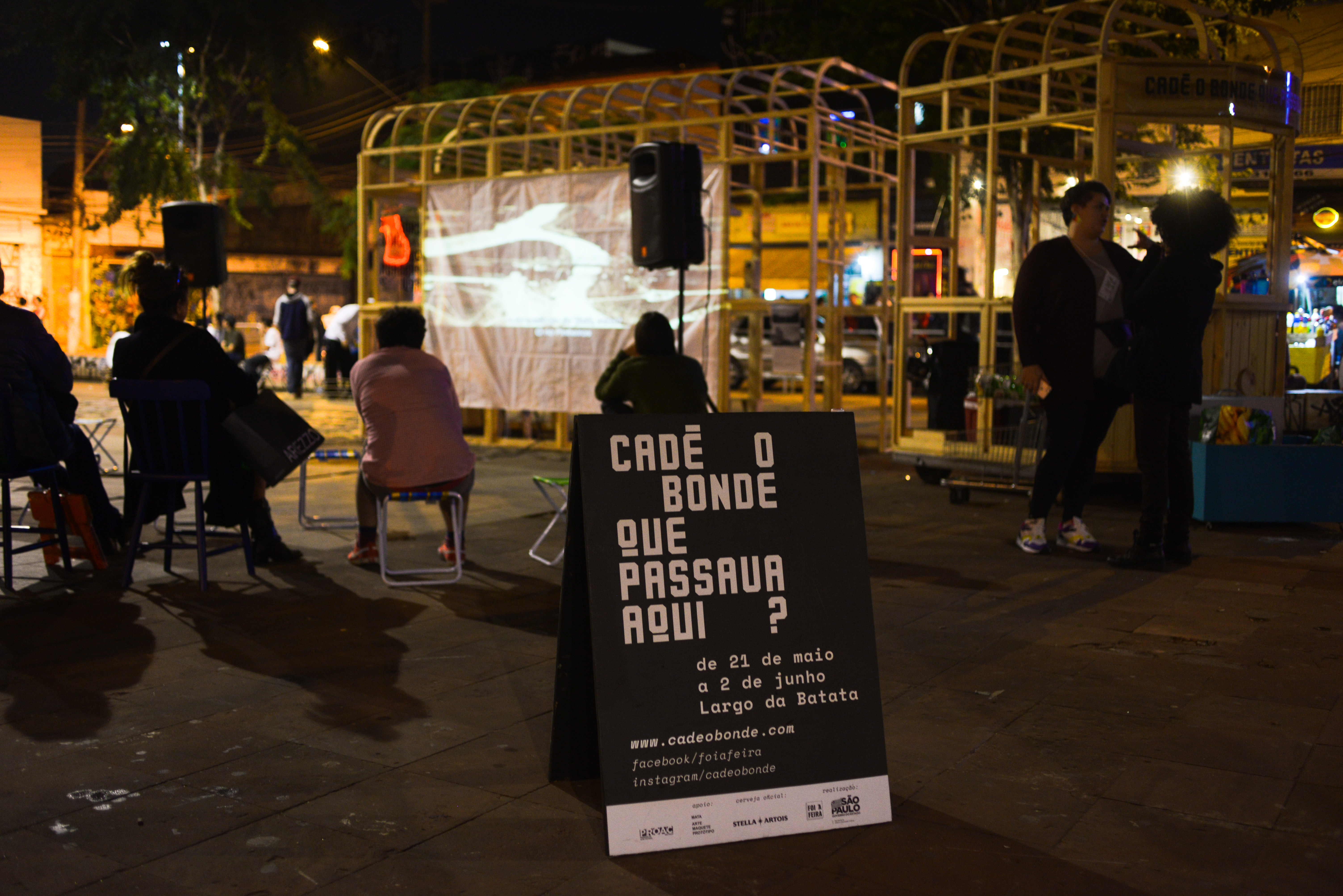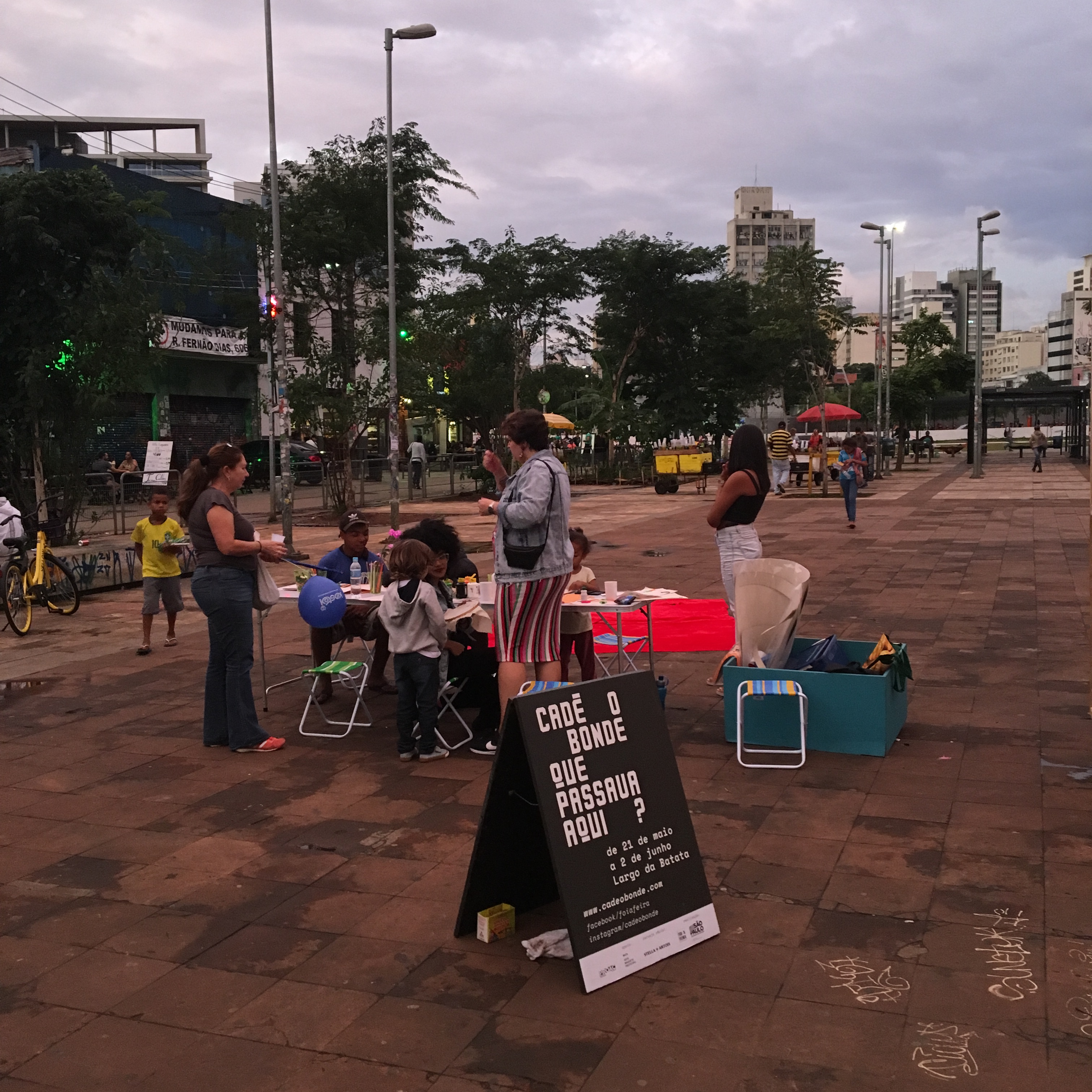 Ocupação artística que aconteceu no Largo da Batata (Pinheiros, SP) Cadê o bonde que passava aqui? foi um projeto aprovado pelo ProAC Editais de Artes Visuais de 2018 resultante de uma pesquisa que partiu do encontro do grupo com um objeto arqueológico: um trilho de bonde. Encontrado durante as escavações para a construção do metrô Faria Lima, o objeto deu início a uma pesquisa de arqueologia simbólica do Largo e arredores, partindo da escuta e convivência com seus frequentadores, moradores e comerciantes. A esta metodologia demos o nome de “Arqueologia da Memória”, partido poético que organizou os conteúdos da pesquisa entre horizontes temporais, história, memória, agora e futuro.